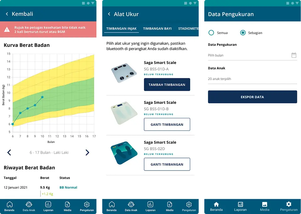 We partnered with Saga, a medical manufacturer, to digitize the Posyandu process through a mobile app and digital body weight scale. This solution allowed healthcare workers to record patient data digitally, ensuring accuracy and enabling instant reporting for both parents and the Ministry of Health. The integration of Bluetooth-enabled scales also allowed for social distancing during weight measurements, addressing both efficiency and safety concerns.